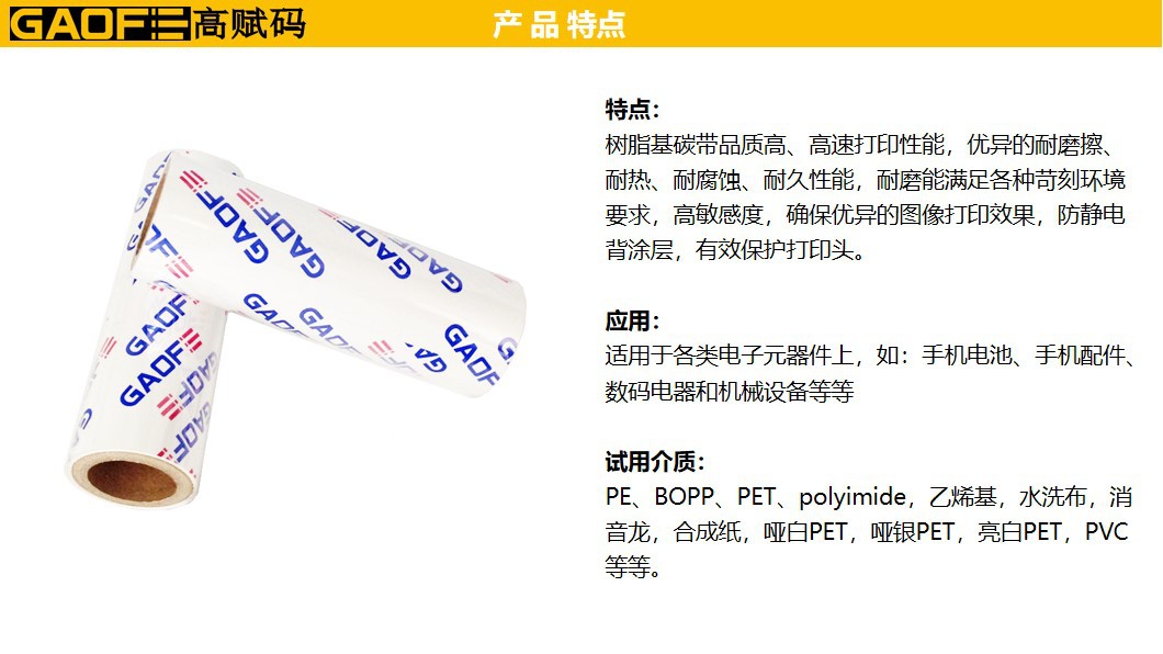 樹脂基碳帶品質(zhì)高、高速打印性能,優(yōu)異的耐磨擦、耐熱、耐腐蝕、耐久性能,耐磨能滿足各種苛刻環(huán)境要求,高敏感度,確保優(yōu)異的圖像打印效果,防靜電背涂層,有效保護打印頭。